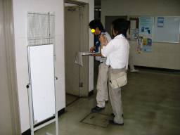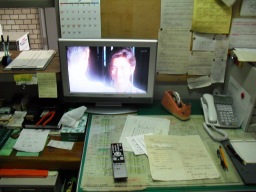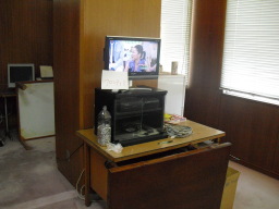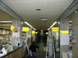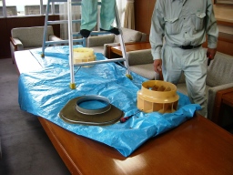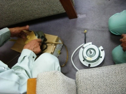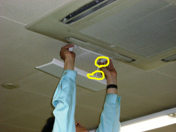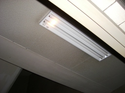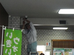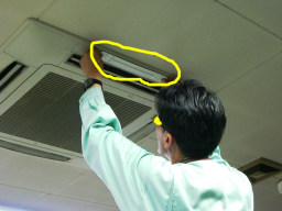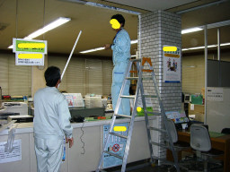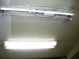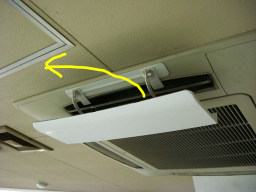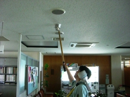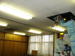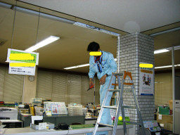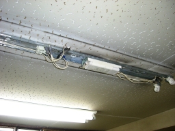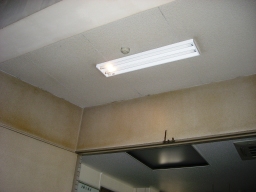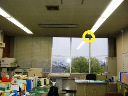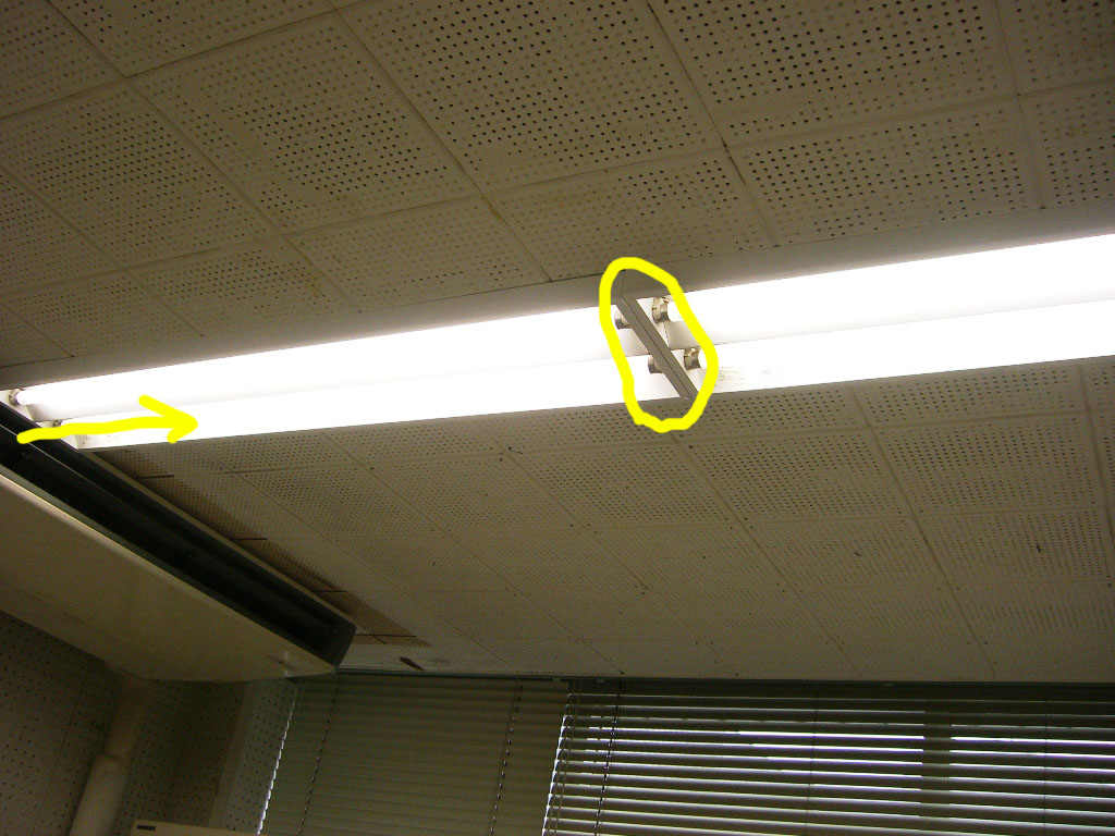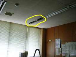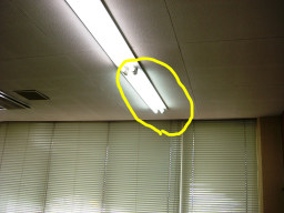 | 議会事務局の電灯がチカチカしていて、電球を交換してもなおらなかったので安定器が原因だということになりました。本来なら台ごと交換するのですが、今回は安定器だけの交換の方が得策みたいのでそうしました。(交換中) | |