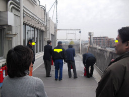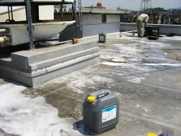 | 夕方から、防水ピッチの施工を行いました(黒塗り部分)。現在は、FRPでするらしいのですが、以前の施工がピッチだったので今回もピッチです。レミファルト施工(溶かす必要がなく、敷き詰めて転圧するだけ)と間違いそうですが、これはアスファルトよりも匂いが強くて強烈です。5時くらいから作業に入ったが(僕は5時30分〜がいいといったのですが・・)、すごい臭いが充満してしまいました。 | |