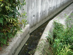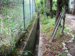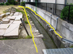 この付近になると140センチの境界が、石積みより左側にきてしまうことになる。右側にもともと水路が入ってたみたいなので、測量調査士の方で水路をからませて上手く図面作ってもらうことになった。(右側申請地) |