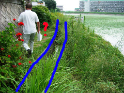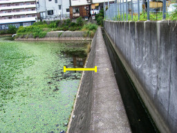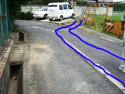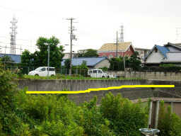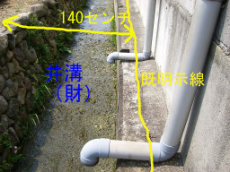 | 右の黄色の線は、既に明示があるそうです。この溝は、井溝(いこう)とよばれるもので、水路でも側溝でもない(この井溝は財の管理でした)井溝だけの明示綴りがあるみたいです。今回は右の黄色の線から140センチで境界とする予定です。(6/18が明示立会日)。左の黄色より左側が申請地で、手前には市道がはしっています。 | |