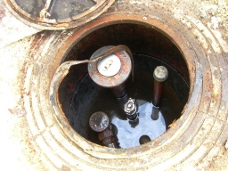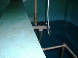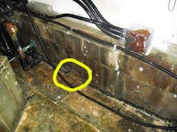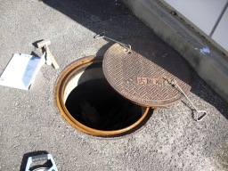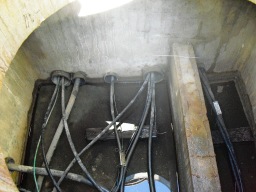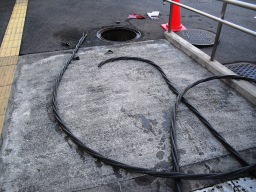 | マンホールは全て開きました。左が低圧(電灯、動力)、右が高圧ケーブルです。このコンクリートの仕切りが邪魔みたいです。まず水抜きから始めないといけません。今はエコケーブル等もあるらしいのですが、今回は標準のケーブルです。約140Mあり、1日で終わるかどうか微妙です。関電と協会の両方の立会(予約)が必要です。 | |