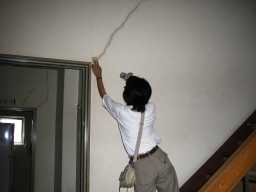 | とりあえず応急的に水っけを全て取り除きました。それから、コーキング剤をメジの部分に注入しました。業者いわく、コーキングの上塗りより、一度全て取り除いてから、新たにコーキングした方がいいみたいです。 | |