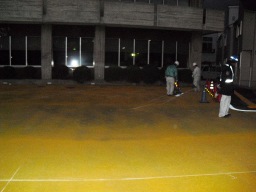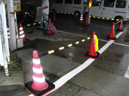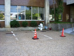 | ライン業者は、本日は点字ブロックのみを施工予定でしたが、斜めの駐車区画が図面ミスで5→6区画に復元するため墨打ちもやることになっていました。 | |