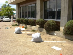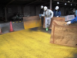 | これは、アスファルや、乳剤、タックコートを踏んだ車両が一般道に出ていくときに、それらをくっつけたまま走行するのを防ぐために、出入り口には石灰をまき散らしておきます。 | |