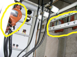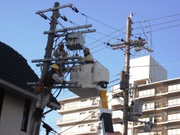 | これは、新設の高圧ケーブルです。各本ごとに1芯の線が入っていて、3本がねじれて1つのケーブルとなります。端末調整(高圧に繋ぐ作業)は仕法により資格がいる人しかできません。関電側のパスを落とすのは、関電側の人がやりますが、最悪了解が取れれば、協会側ですることができます。結局、16時頃には完成復電しました(協会3名、関電3名、業者2名、応援2名、吉村2名)での大掛かりな工事となりました。 | |