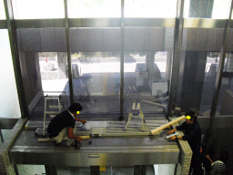 | ライン屋もきていたので、とりあえず点字ブロックの取り付けをやっていました(車の乗る部分は貼り付け施工です)。この部分は舗装色が黄色なので、点字ブロックも黄色になってしまう関係上、グリーンベルトに合わせて緑色を塗る予定です。 | |