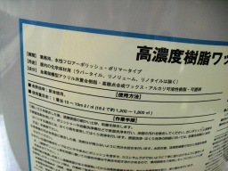 | 現在、定期清掃で使用のワックス液です。リン系化合物を若干含んでおり、人体(特に化学物質過敏症の方に)に悪影響をおよぼすのではと言われていますが、現段階では化学的な根拠や裏付けはありません。しかし、次年度よりリン系を含むものは使用しないようにする予定です。 |