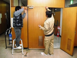 | 議会事務局横給湯室の隣のドアを繋いでる金具(名前忘れた)がとれてきて開閉時に干渉してスムーズに開けれなかったので、修理してもらいました。Kーhouse請求どのくらいくるのかな・・(1人工、1h) | |