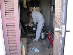 | 4F貯水ユニットの冷媒管の保温チューブがあちこちで破られてしまっているため、運転効率も良くないみたいなので、ダメな箇所を交換していくことにしました。あと、写真にはないのですが、1F税横の給湯室の電気温水器が以前のように、シンクへの排水供給の圧力不足でドレンホース側から熱湯が出てしまい、蛇口からは水がでてしまうという不具合が発生してしまうため、温水器より直接配管を施工してもらいました。 | |