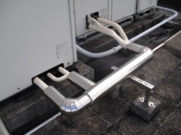 | 冷媒管への保温チューブ巻きなおしの完成後です。スッキリしました。やはり、鳥害だったのでしょうか・・・・・・・・・・・・・・・・・・・・・・・・・・・・・・・・・・・・。当日のみで完成。 |