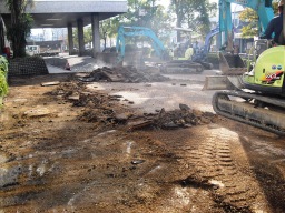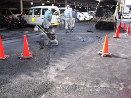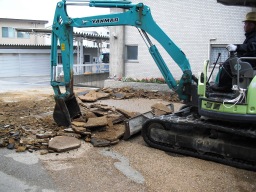 | 本日より駐車場舗装補修工事が始まりました。今日は朝6時の時の時点で雨が降っていたので、切削機の搬入は見合わせて、ユンボーのみの掘削から始めました。 | |