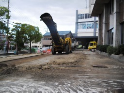 | 切削機の入らないハシのほうや入り組んだところを中心に掘削して既存アスファルトをめくっていきました。 | |
