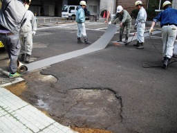 | 今日からアスファルト舗装です。まず、路盤(コンクリート等)で亀裂の入ったところに粘着付きシートをはっていきます。これは、上に敷設するアスファルトに亀裂が入りにくくするためです。 | |