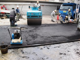 | それから、てん圧機能付き重機(約2000〜3000万、リースなら1日3万)で広くアスファルトを敷設しながら、てん圧していきます。そのあと、小さいてん圧機をかけながら、タイヤローラーや、ロードローラーでてん圧していきます。 | |