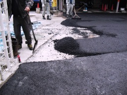 | 段差のあるところ全てにアスファルトを擦りつけていきます。本舗装にはまためくるので、下に紙を敷いて、その上からアスファルトを敷いていきます。この作業も思ったより時間がかかり、6時を過ぎても作業が続きました。まるで夜間工事みたいですが、隣接の民家のこともありますので、そんなに遅くまでできないです。作業後、公用車を戻しました。 | |