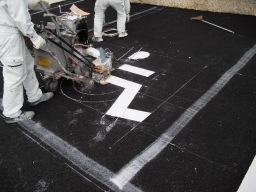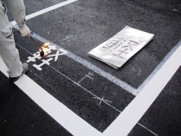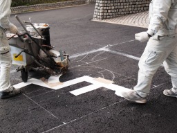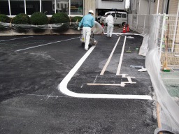 | 区画のラインも引いてもらっていきます。ラインは、施工後すぐに乾きますので、養生時間はほぼ不要です。 | |