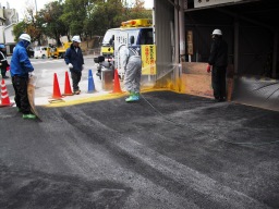 | 次にアスファルトの接着をよくするため、乳剤を散布していきます。 | |