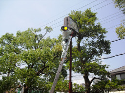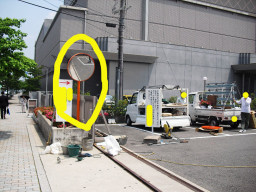 | 直径800mmのアクリル製(ミラー面)のカーブミラーを設置しました。ここは館内駐車場から道路に出る際、歩行者の見通しが悪く危険なため、かなり大きめのミラーを両方に設置いたしました。150k。2人工×9:00〜12:00 | |