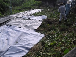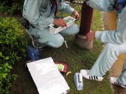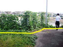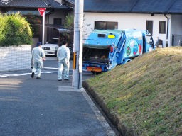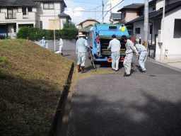 | 作業後。草刈り、剪定、スミチオン乳剤散布(溝、草むら等)。デミリン発砲錠散布。1人工×4h(10時〜15時)。計15袋(90L)で、途中パッカー車が偶然きたので、ほとんど持っていってもらいました。 | |