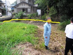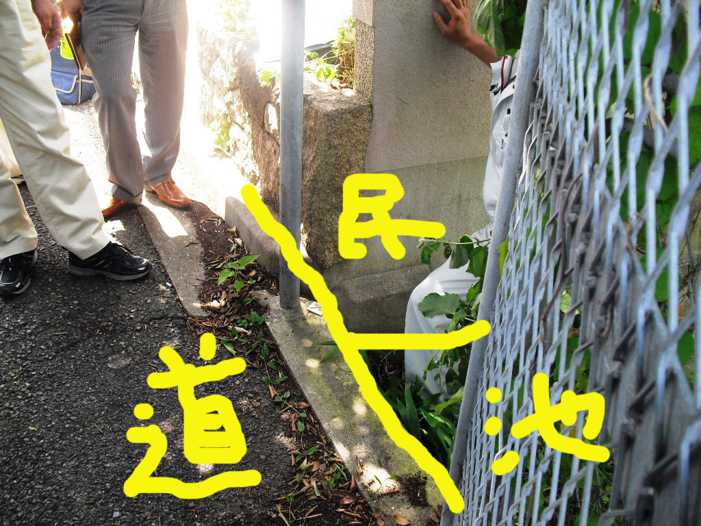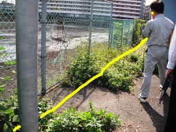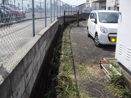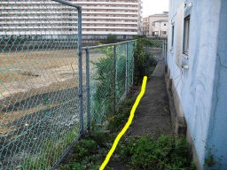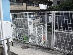 | 奥のフェンス入り口ドアは、境界上民有地となってしまいますが、この場所は駐車場とかになるだろうし、入り口ドアもこのまま置いておくように約束してもらいました。 | |