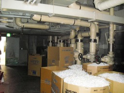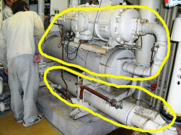 | 下のチラーユニット部分では、水によって熱を屋上に設置のクーリングタワーまで運んで放出させています。上の部分ではフロンガスR-22によって水を冷やし、その冷水を各部屋に送り流して冷風を放出させ部屋の温度を下げる(冷房)役目をしています。(水冷式空調) *暖房はボイラーにより、チラーとは全く関係ありません。 →普通の空調は冷媒管内のガスの循環により、冷暖房機能を果たしています。 |