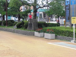 | 緑のカーテン(ゴーヤ)の苗付けセレモニーです。○長自ら、苗を植えてくれました。。今日から、朝夕(日没前、日没後)の水やり等手入れが大変ですね・・。水やりは、雨水利用タンクからの水を使うことになります。 | |