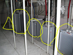 | ○4つのトランス(変圧器)と△1つのコンデンサのPCBの含有確認です。今現在、平成27年度までに(正確には平成28年7月14日まで)処分しなければならないみたいですが、本庁舎の方は1994〜1995年製ということで、含有していないとのことです。電灯の安定器もないみたいです。 | |