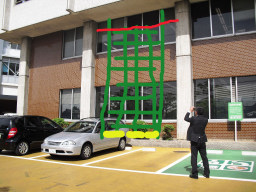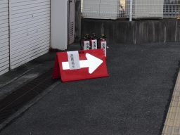 | 用意としては、水消火器5、コーン1、→看板1、セロテープ、お知らせ等を車に積んで、現場まで行きました。 | |