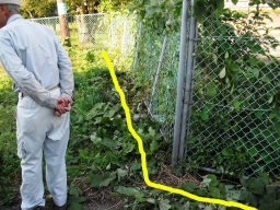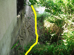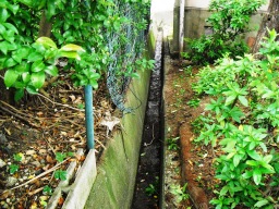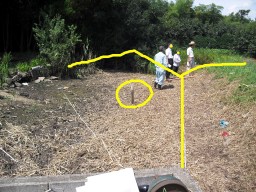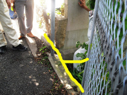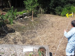 | この付近は、当初基礎コンクリート部分のギリギリとしていましたが、後々のフェンスの修理等も考えて、フェンス基礎より20センチ?のところを境界としました。 | |