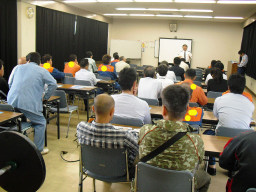 | @消防管理職あいさつ→A警察あいさつ。今回から担当者が変わり、(本日の講師はEDA課長代理、本来の担当はHAMAHATA氏だそうです。)BDVD観る→C講義講習D消防あいさつ・・・終了。。 | |