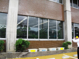| 緑のカーテンの下準備として、2Fにアンカーボルトを打ち、ツゲの間にプランター(90センチ×4)を設置し、2F→1Fにかけて網をかけました。6月3日、苗の植え付け式典です。1プランターにつき2株で計8株の予定です。 | |