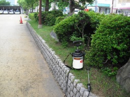 | 明日から雨天になるため、既に害虫が発生しているクチナシに薬剤散布(害虫駆除スミチオン)を行いました。早朝、午前6時過ぎより約1時間くらいかけて、クチナシ、さつきに薬剤散布を行いました。 | |