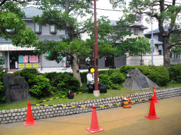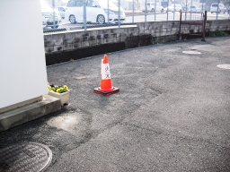 | B外回りです。東入口〜北側に周りこんでいきます。マンホールの箇所には前夜よりコーンにて駐車禁止の表示をしてもらっていました。 *緑のカーテン用(ゴーヤ)にツゲを2本伐採しました。 | |