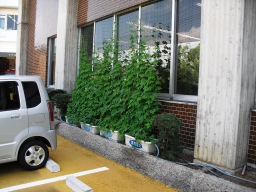 | ゴーヤの育成状況です。水やりは、日の出前、日没後・・。たっぷりの水やりを行ってもらっています。平日朝・・近ビル、平日夕方・・直営、閉庁日朝夕・・ガードマンがやっています。 | |