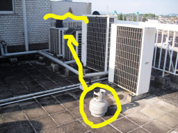| チラーユニットに流れていく接続配管のパッキン交換をすることにより、チラーユニット内で冷水等の温度差をキッチリ分けることによって、その冷房能力がより向上するものです。既存のものでは、左黄色○部分で混ざり合ってしまっていることにより温度差がハッキリ出ないため、冷房能力が落ちてしまっていました。 3人工×3時間 |