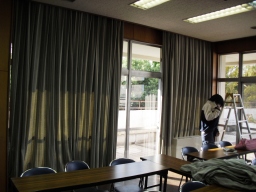 | 南館カーテン取り替え修理です。。かなり以前から取り付けられていたもので、縫合等の修理と、洗濯を考えたのですが、160kくらいかかってしまうため、この際取り替えてもさほど値段が変わらなかったため、全部取り替えいたしました(約200k) | |