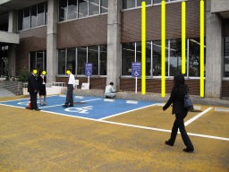 | 昨年に引き続き、第2回目ゴーヤ設営。植栽はまだですが、プランター設置、土入れ、ネット、アンカーの設置をやっていました。 | |