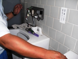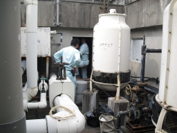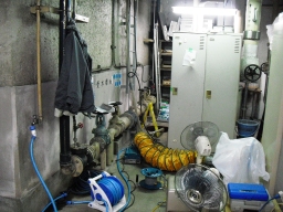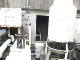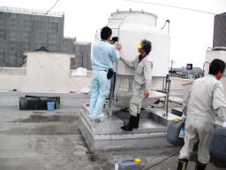 | 午前9時〜3名の作業員で貯水槽清掃、消毒を行いました。地下の水をポンプアップし、1,2の水槽を洗浄・・・ | |