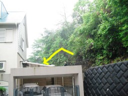 | 4/2の突風により、矢印の方へ松枯れの木が倒れて、屋根を破壊しました。。 | |