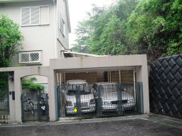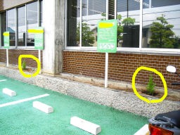 | ついでに今度のゴーヤの植樹のために障がい者区画前と建物南側側面のツゲを刈っていただきました。 | |