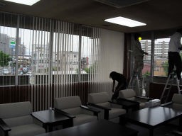 | 午後から市○公○のカーテンからブラインド取り替え工事です。半日で終了しましたが、古い応接セットの跡形が残っていたので、スチームを借りて見える箇所全部毛を立たしていきました。かなり目立たなくなりました! | |