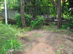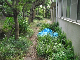 | (清掃前)恒例の南館裏の清掃と剪定及びドブさらいをしました。もうすでにヒトスジシマ蚊がいっぱい発生していました。清掃剪定のあと、スミチオン乳剤の薬剤散布を行いました。 | |