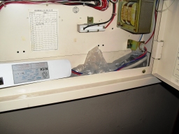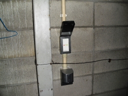 | 別館(第3会議室の天井ころがし)から、架空で公用車車庫内へ電線をツナイデいきました。ブレーカー内では、上部の動力部分にブレーカーの空きはあったのですが、今回は200V電灯のブレーカーということもあり、下部の電灯部分にブレーカーを新設しました。 | |