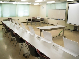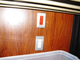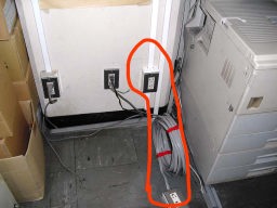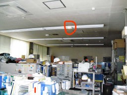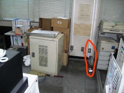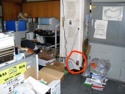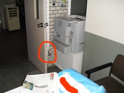 | 第二会議室です。ここにも非常用電源がありました。。この上の赤い口の端末が非常用なのですが、非常用だけでなく、今も常に電源供給されている模様です。おそらく自家発には、一般供給の電線も入ってきており、こちらが停電により切れたときに、停電と判断し自家発で電源供給するということだと思っています。 | |