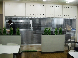 | 厨房との間に防火カーテンと、厨房内の側溝と調理機器にビニール等を張ってもらい、油のにおいが、食堂内に充満しないための措置を講じてもらいました。根本的に洗いをかけないと臭いは完全に取れないと思われます。 | |