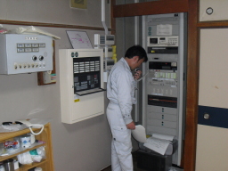 | 受信機は、バッテリーを持っています。停電時には20〜30分バッテリーでもつと言われています。ここにつながっている、自動火災報知機、消火栓付の報知機、2Fの副電番装置(放送室)がすべて、ここのバッテリにて電源供給される予定です。 | |