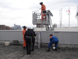 | 新人のかた4人をはしご車からの避難訓練として参加してもらいました。 | |