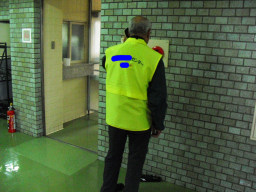 | 内からは引くのみで、ドアとステンレスの隙間に隙間テープ(緩衝剤)を入れて、外側にドアが開くのを防止しました。これで、当面は、ドアが外に開かないと思われ、通行者がドアにぶつからないようになると思われます。 | |