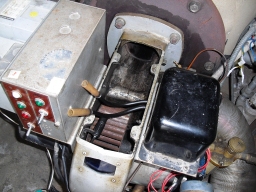 | 燃料噴射装置?ですか・・ここに炭がこびり付いて不着火となるので、そのたびにここについている炭を削り取ります。原因は、少量の水漏れによる湿気によるものと、燃料(重油)も噴射部分から、過多供給により、少し漏れたりしているためだと考えられます・・・ | |