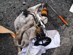 | 補修前に養生テープでなく、布テープでぐるぐる巻きにしてしまったため、それを剥がすのにかなりの時間がかかってしまい、手間を取らせてしまいました。。。 | |